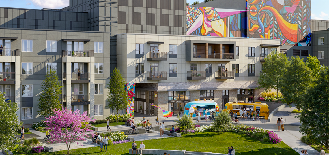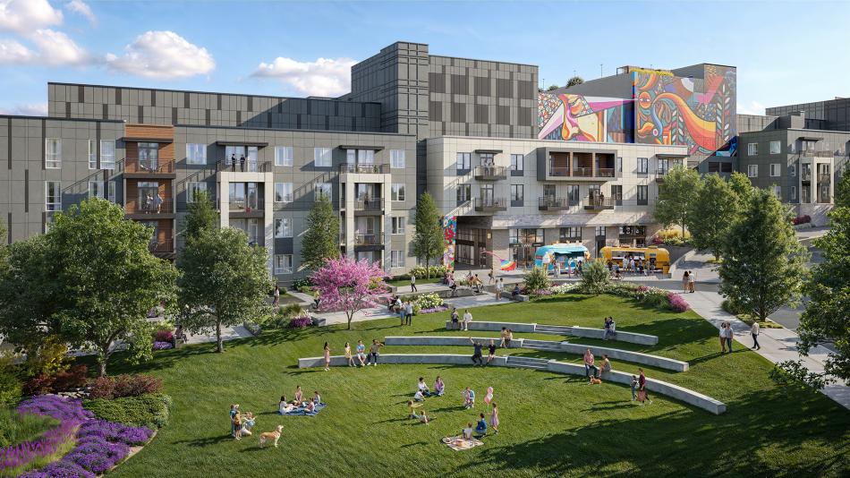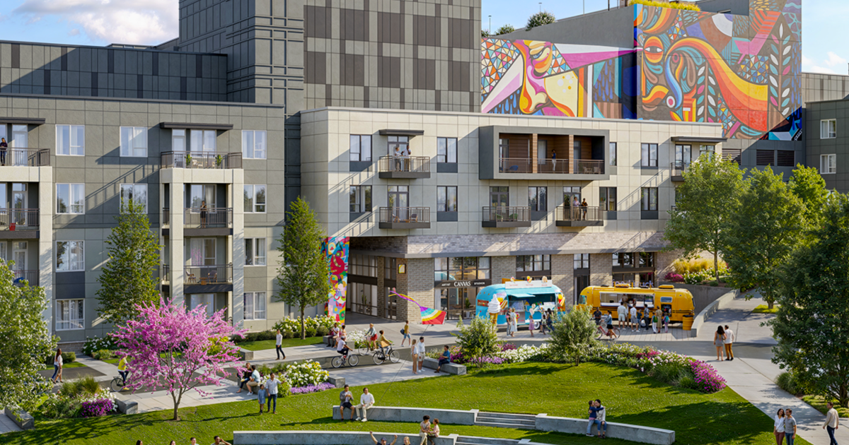 Fresh rendering illustrating a 1-acre park facet at Halo planned between main structures and the area's MARTA station. Courtesy of Northwood Ravin; designs, Dwell Design Studio