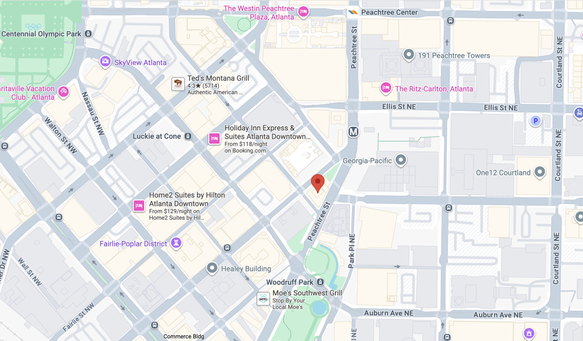 Residence Inn by Marriott's 134 Peachtree St. NW location in relation to Woodruff Park, Centennial Olympic Park, and other downtown landmarks. Google Maps