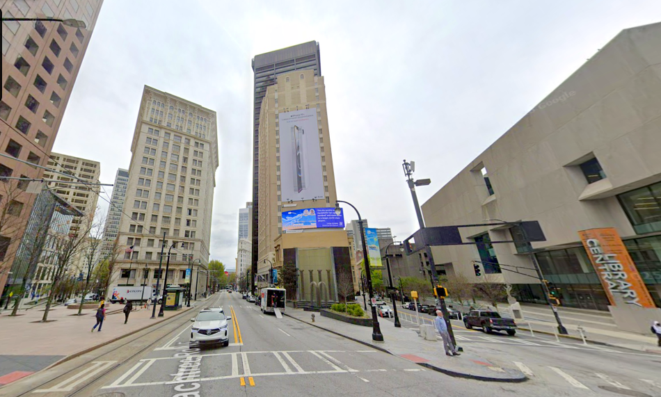 Looking south, today's Residence Inn by Marriott (center) in relation to, from left, Georgia-Pacific Center, the Candler Building, and Atlanta's Central Library. Google Maps