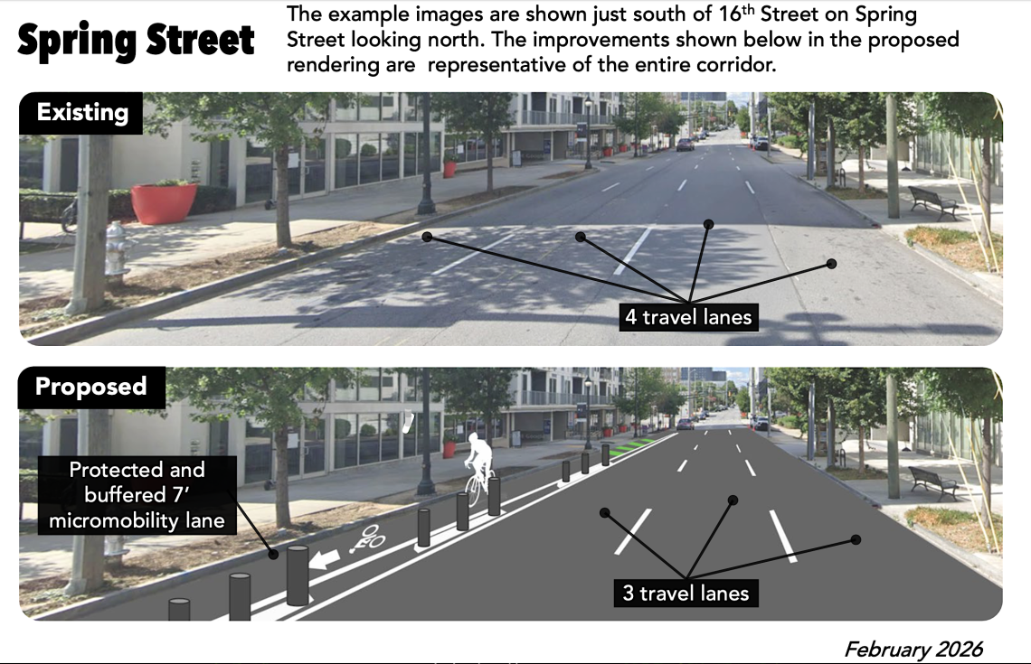 Midtown Alliance revealed this week that safety improvements for non-drivers are set to ramp up across 2026 on two of the district’s main corridors—Spring Street and West Peachtree Street—as part of long-planned improvements pushed by the City of Atlanta. One section of work is already underway on Spring Street.