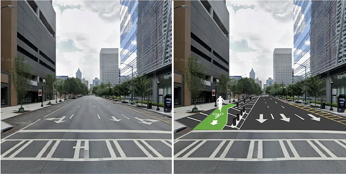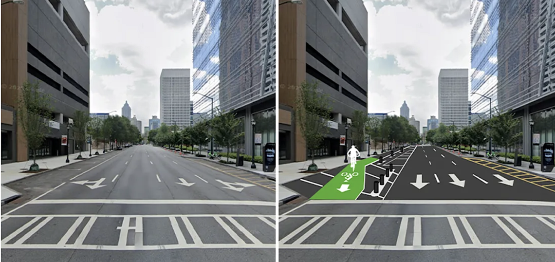 That’s repurposing one southbound traffic lane into a protected lane for bicycles and other non-motorized transport. Other components include wider sidewalks, traffic signal upgrades, pedestrian lighting, ADA upgrades, and street trees, per Midtown Alliance.