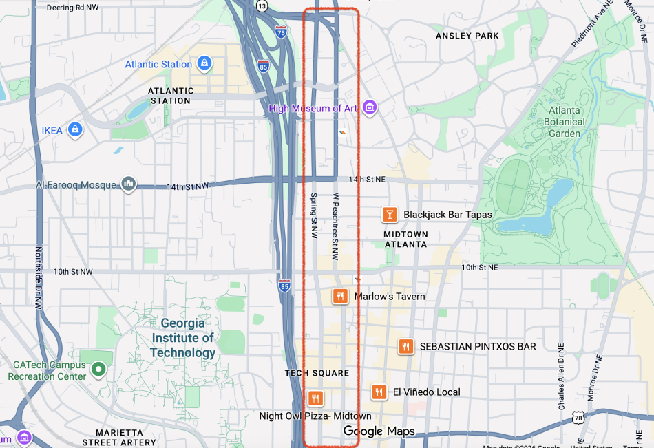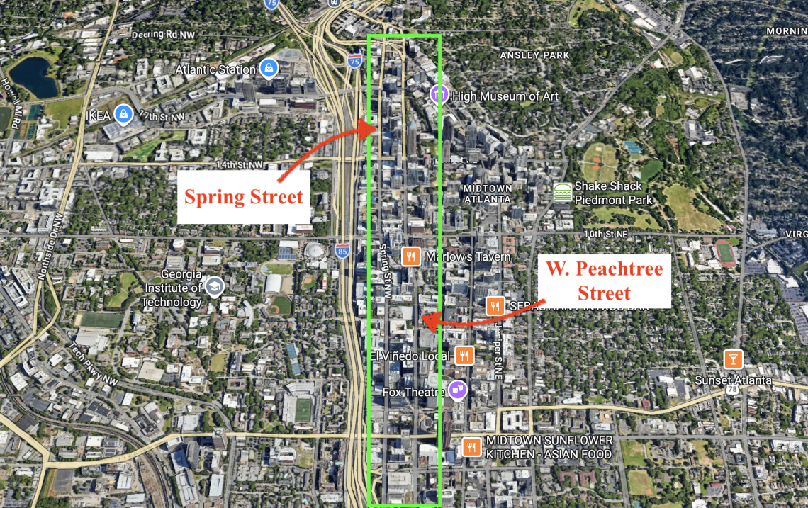 Rough scope of planned Spring Street and West Peachtree Street multi-phase safety improvements across most of Midtown. Google Maps/UA