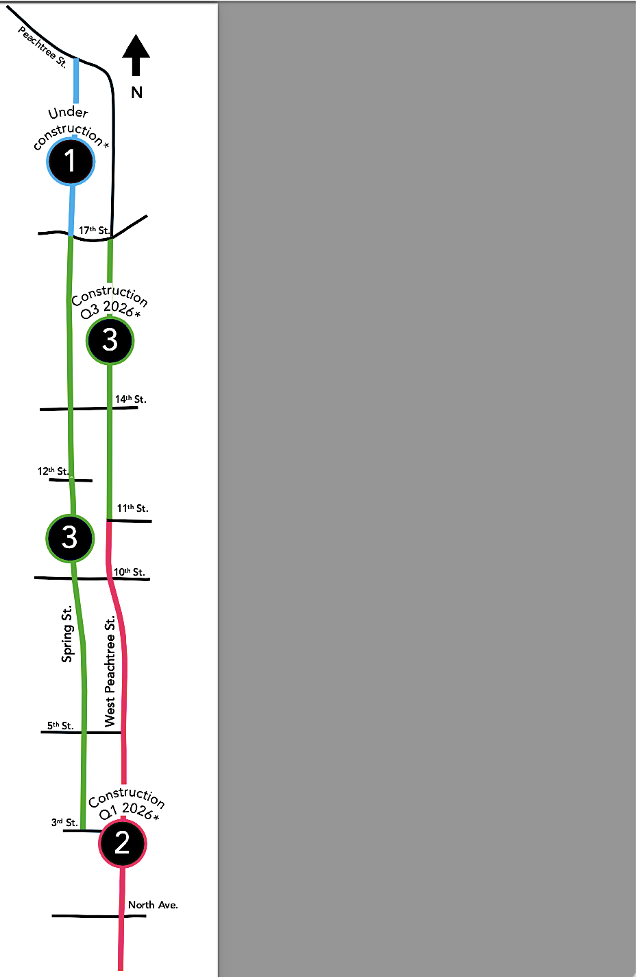 Now: What’s under construction today, according to Midtown Alliance, is the section of safety improvements on Spring Street, stretching from 17th Street (near Atlantic Station) up to Peachtree Street.