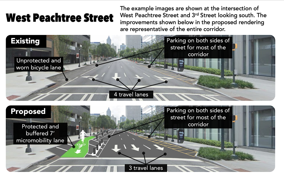 The works calls for adding a protected one-way bike lane by repurposing one travel lane and several on-street parking spaces on West Peachtree between 11th and 17th Streets, and on Spring between 12th and 17th Streets. Expect ADA and bus stop enhancements along those stretches as well.