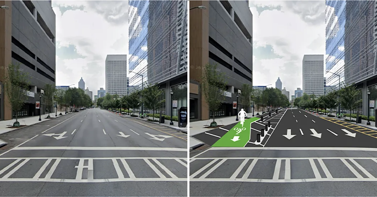 The projects will create a north-south, paired experience of protected bike lanes across most of Midtown, roughly stretching from Peachtree Street down to a block south of the Bank of America Plaza tower. The partnership effort with the city dates back to a $5-million plan announced in 2019 by Mayor Keisha Lance Bottoms’ administration following a spate of four fatal scooter accidents across the city over just a few months.