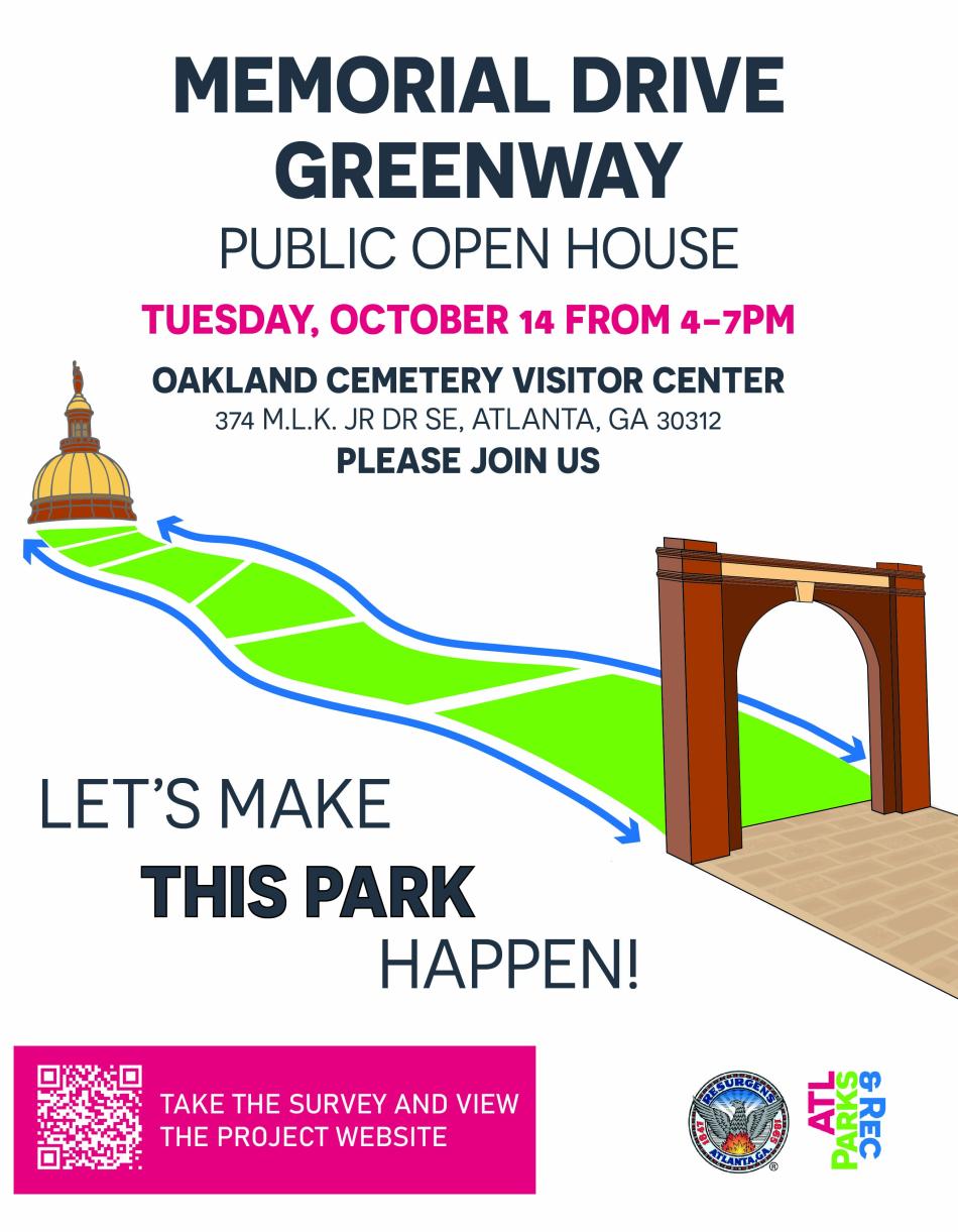 The first Memorial Drive Greenway public Open House is scheduled from 4 to 7 p.m. Oct. 14 at the Oakland Cemetery Visitor Center (374 Martin Luther King Jr. Drive SE).