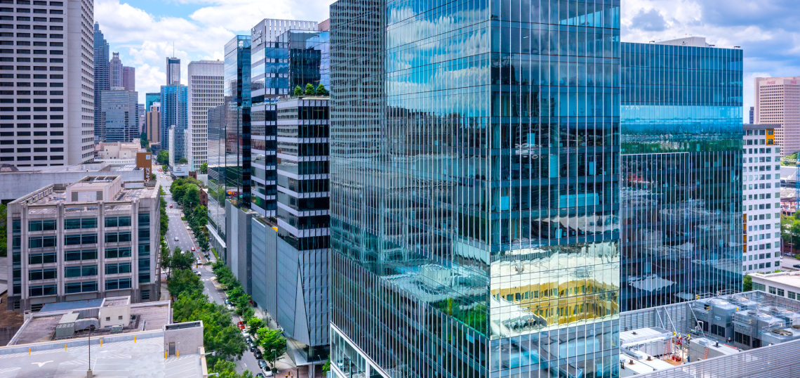 The glassy, L-shaped structure stands just north of 4th Street, between Spring and West Peachtree streets, and features 25,000 square feet of retail, 20,000 square feet of outdoor space, and a 9.6-MW data center.