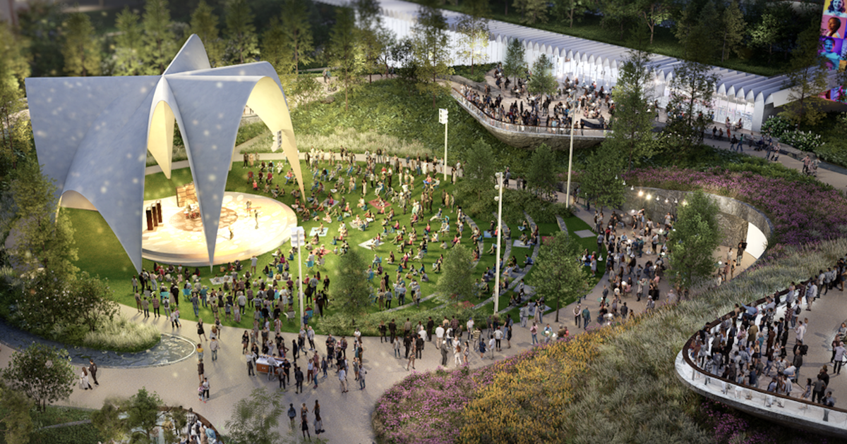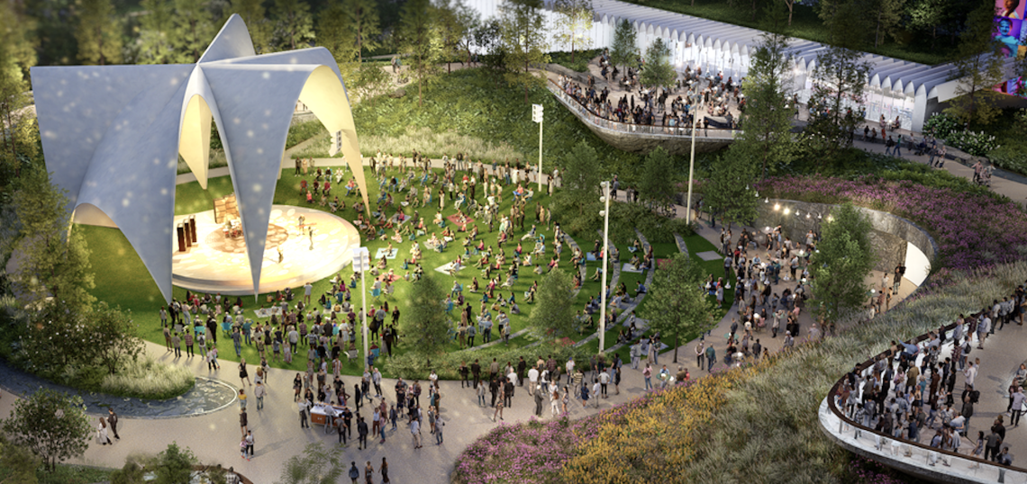 • Central showpiece: “At the heart of the site is a striking pavilion inspired by the form of a magnolia blossom, with soaring arches and curves influenced by the work of Alexander Calder, the sculptor renowned for his ability to take heavy material and create a sense of lightness... The pavilion is flanked by a flexible amphitheater with terraced seating that can accommodate casual use or events with up to 800 attendees.”