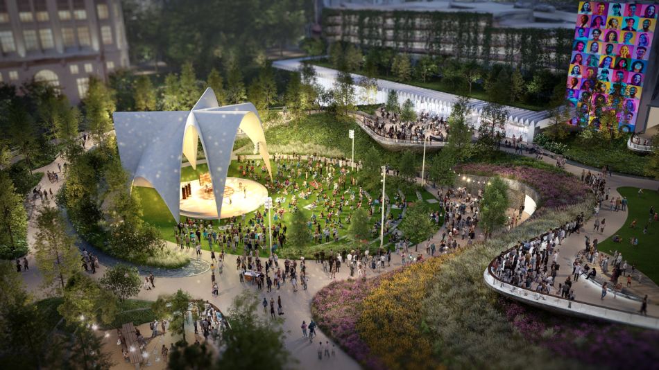 The 4-acre, centralized greenspace is broadly described as a “new cultural and civic destination … without walls” that places an emphasis on accessibility, programmability, and artistic elements, with Midtown’s towering skyline as a backdrop.