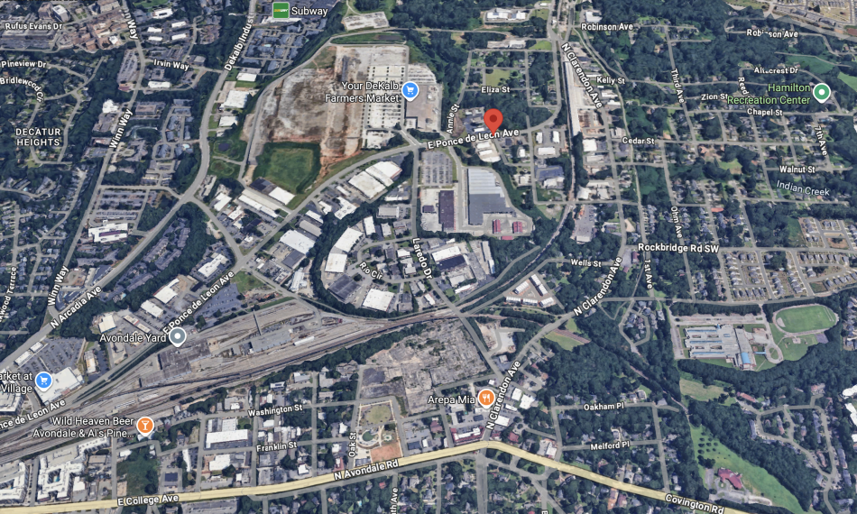 The proposed Scottdale townhome site (in red) at 3128 and 3156 E. Ponce de Leon Ave., with downtown Avondale Estates shown at bottom. Google Maps