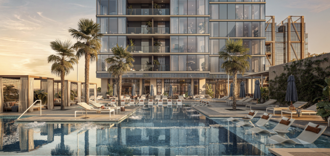 Pool and deck area at Alina described by designers as being worthy of resorts. Courtesy of TVS and Rockefeller Group