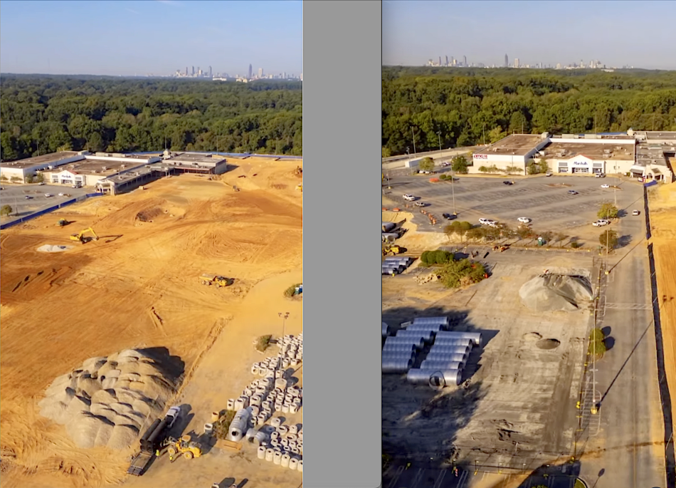 Real estate developer Edens recently shared aerials of North DeKalb Mall’s demolition on social media that show the mall has been almost fully wiped away—apart from larger retail buildings that will be incorporated into new development—allowing for infrastructure work across the 73-acre site.