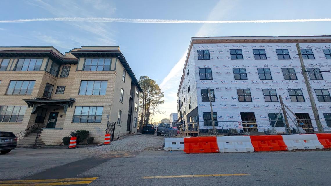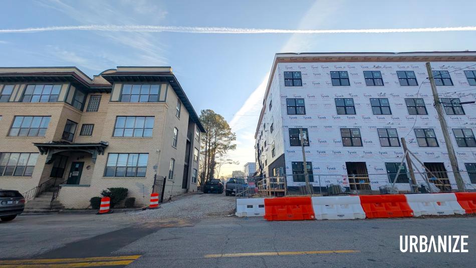 Juxtaposition of existing residential dwellings (left) and forthcoming City Lights North Block units along Parkway Drive this week. Josh Green/Urbanize Atlanta