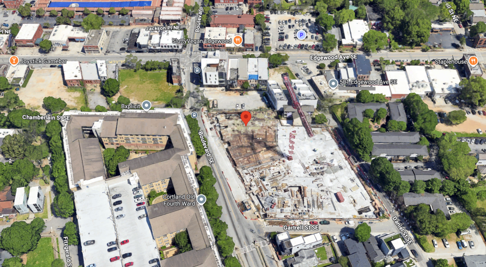 The Waldo's site in the context of Edgewood Avenue businesses and Old Fourth Ward blocks. Google Maps