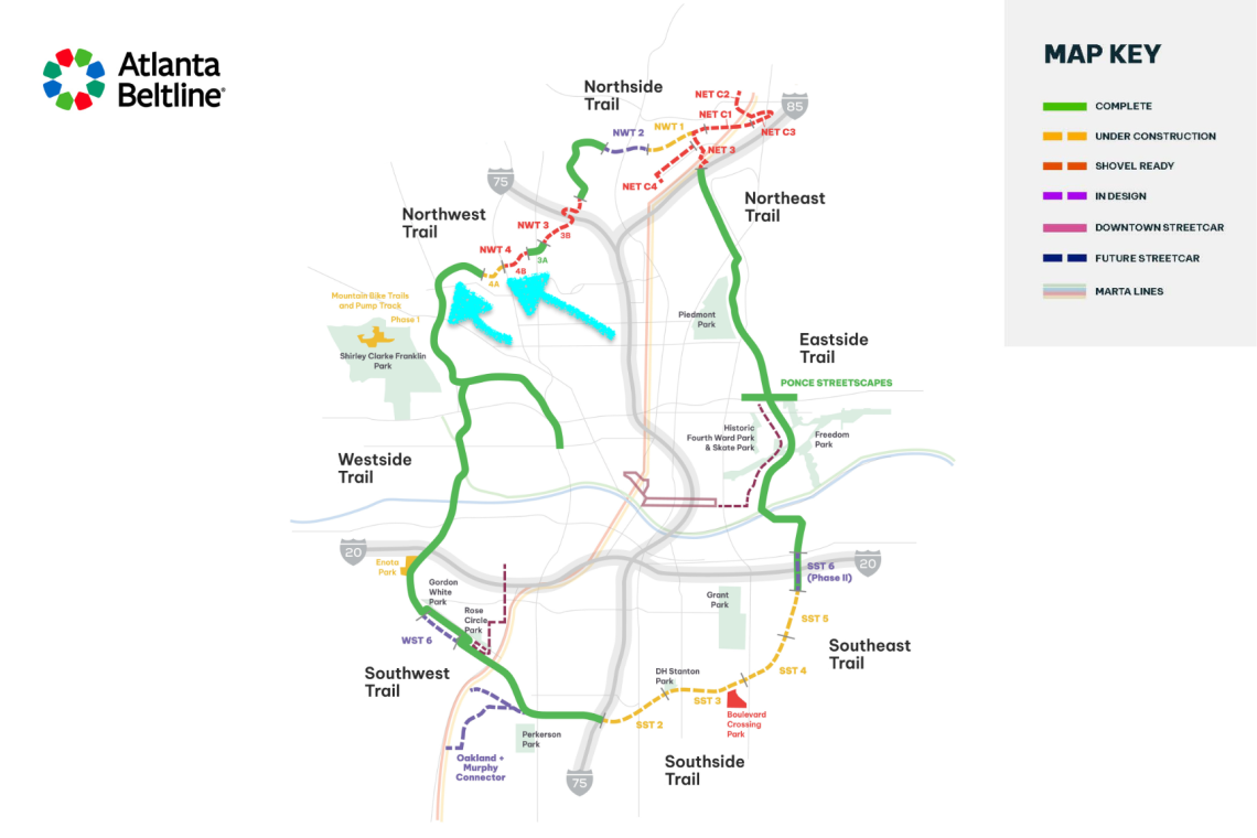 The Northwest Trail sections in question, as shown in this photo essay, in context of the 22-mile Beltline loop. Atlanta Beltline Inc.