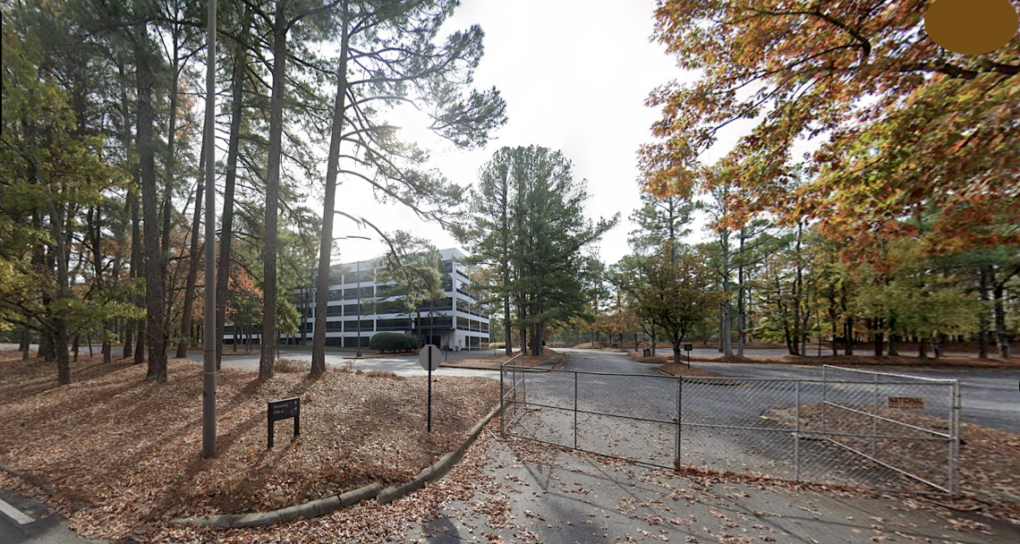 The 248,272-square-foot Tucker Exchange office property, as seen vacant behind fences in 2024. Google Maps
