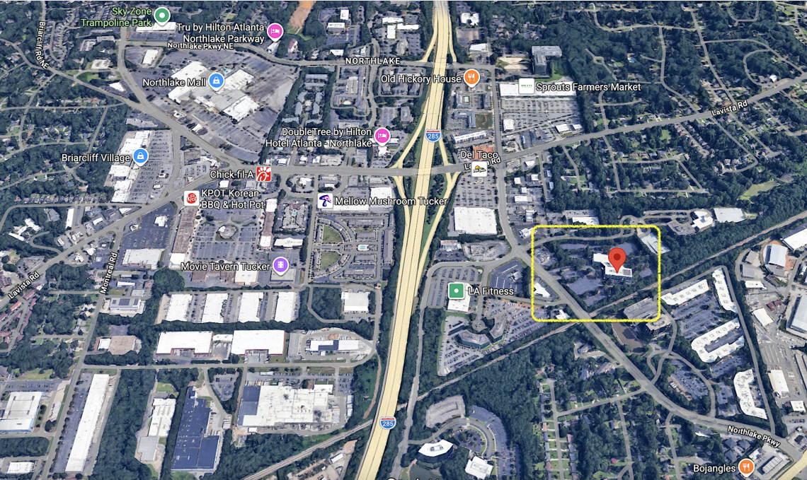 The 13-acre Render Tucker site (in yellow) in relation to I-285, Northlake Mall (top left), and other area landmarks. Google Maps