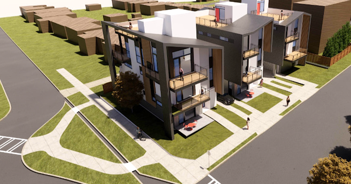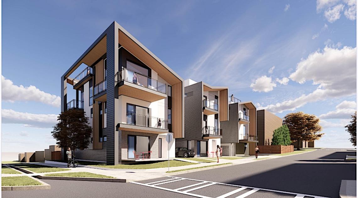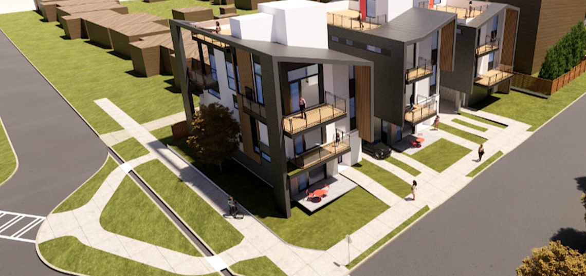 Additional features will include lock-off suites, elevator infrastructure, small yards, decks off living areas, and two-car garages accessible from behind the homes.