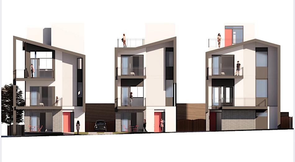 Now, site plans call for three standalone modern houses—each with four bedrooms, plus a study, and three and ½ bathrooms—beneath rooftop hangouts with city views that are rated for hot tubs, per Zaitsev.