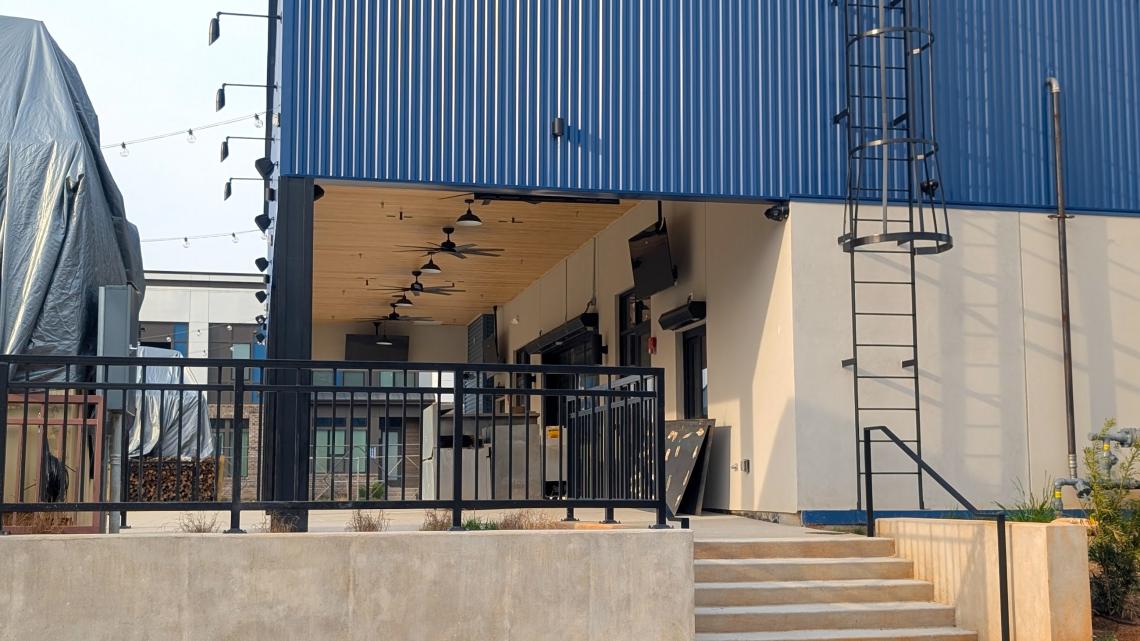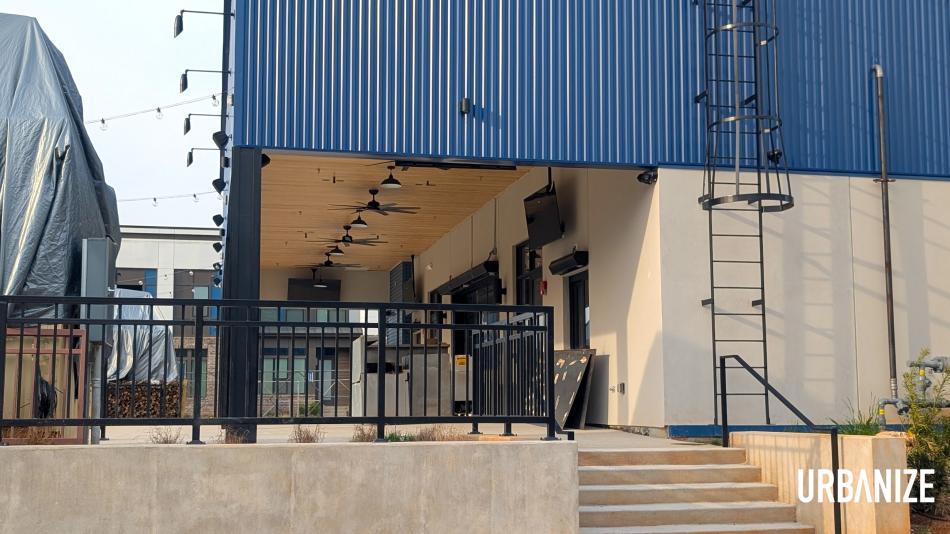 How the greenspace-fronting back patio area has come together at Vela Park Food Works. Josh Green/Urbanize Atlanta