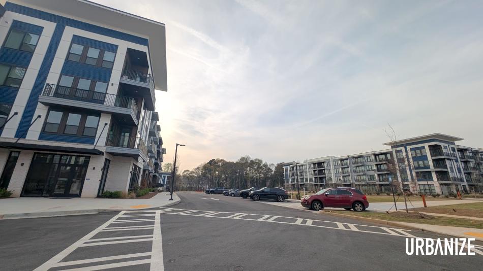 New Vela Park rentals and the large central greenspace, adjacent to the forthcoming food hub. Josh Green/Urbanize Atlanta