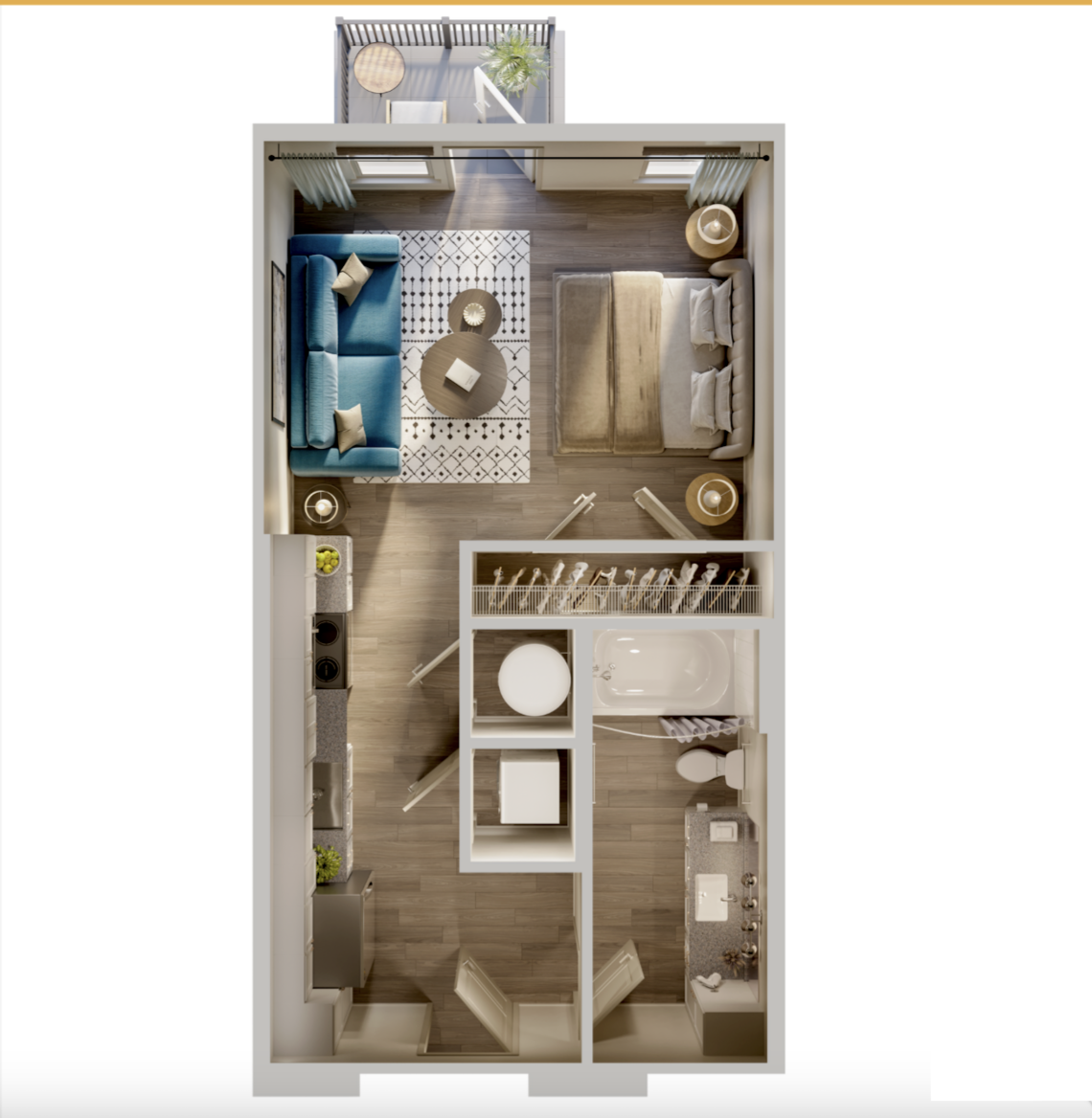 Floorplan for Nova River District's least expensive rental option, a 473-square-foot studio. Courtesy of CCI Real Estate/Nova River District