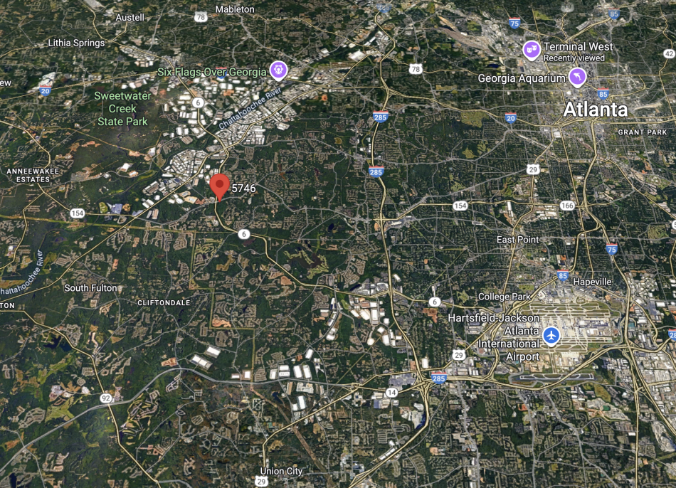 The 5746 Campbellton Road site where Sandtown Village is planned (in red), in relation to downtown, I-285, the airport, and other landmarks. Google Maps