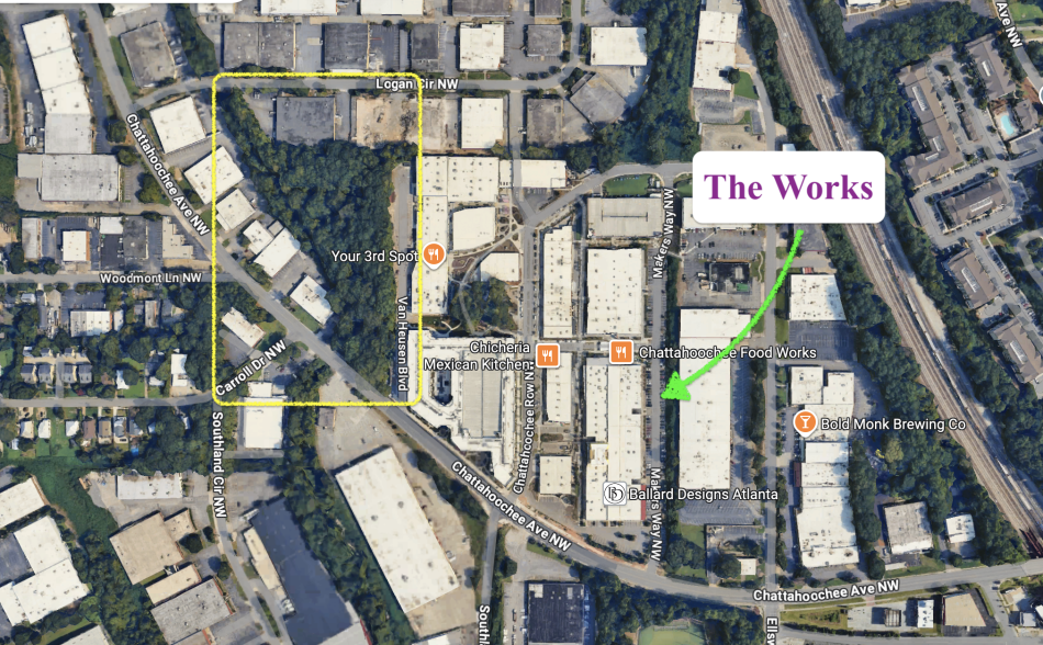 Location of the under-construction Silver Comet Connector Segment 3 section in question (yellow) in relation to mixed-use district The Works. Google Maps