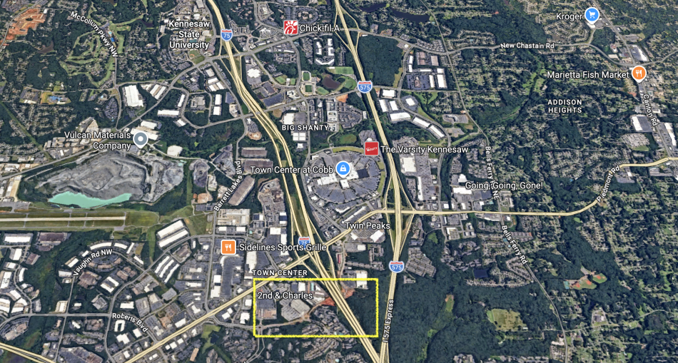 The Cobb County area in question (bottom) near the I-75, I-575 split and Town Center at Cobb mall. Google Maps