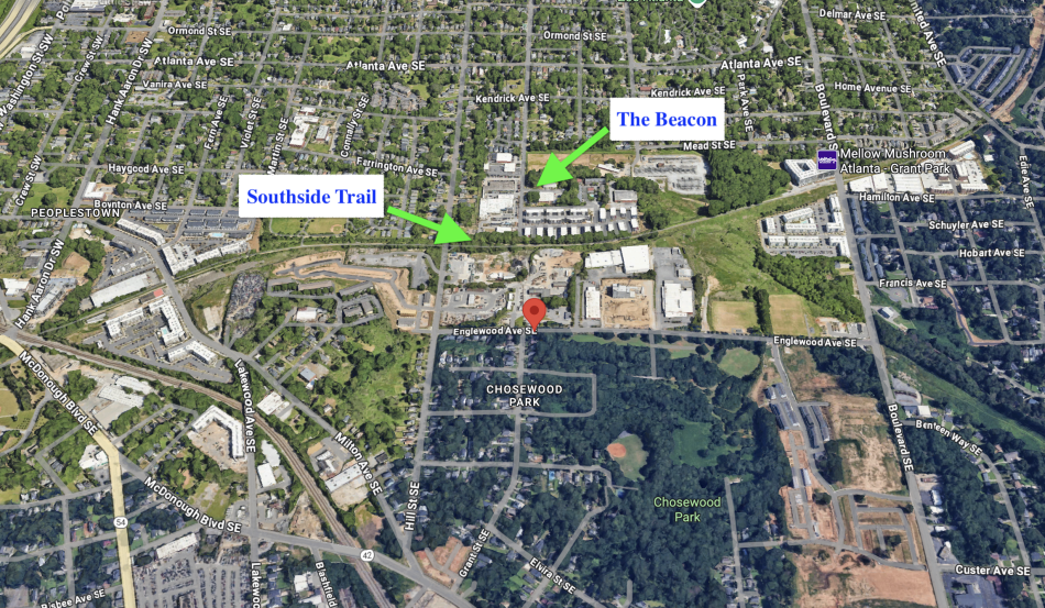 Overview of the 401 Englewood Ave. SE site in question (in red), where 200 new residences and retail space are now in the pipeline. Google Maps/UA