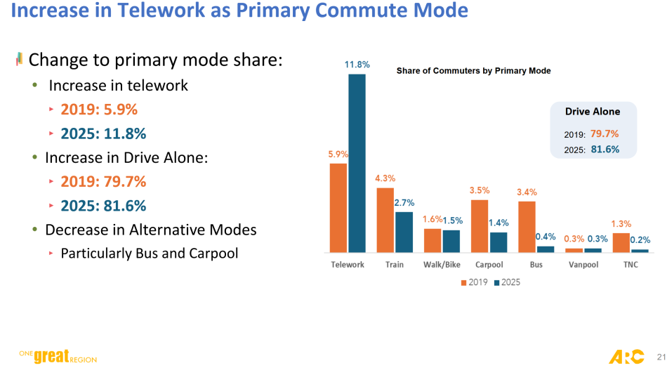 Teleworking rates have doubled as a primary means of commuting since 2019 (up to 12 percent now), but alternative modes of transportation in metro Atlanta are still down across the board, with the exception of vanpooling, which remained flat at a relatively miniscule .3 percent. (Why? Logic says less people physically going to work will need fewer means of getting there, among other factors.)
