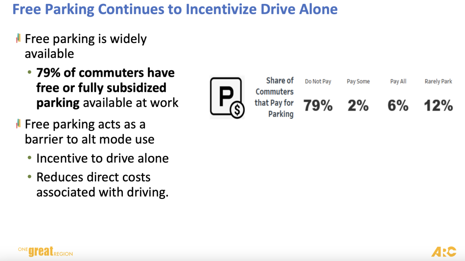 Another “barrier” to alternate transportation is widely available free parking in metro Atlanta, with 79 percent of commuters reporting access to free or fully subsidized parking at work, according to ARC stats.