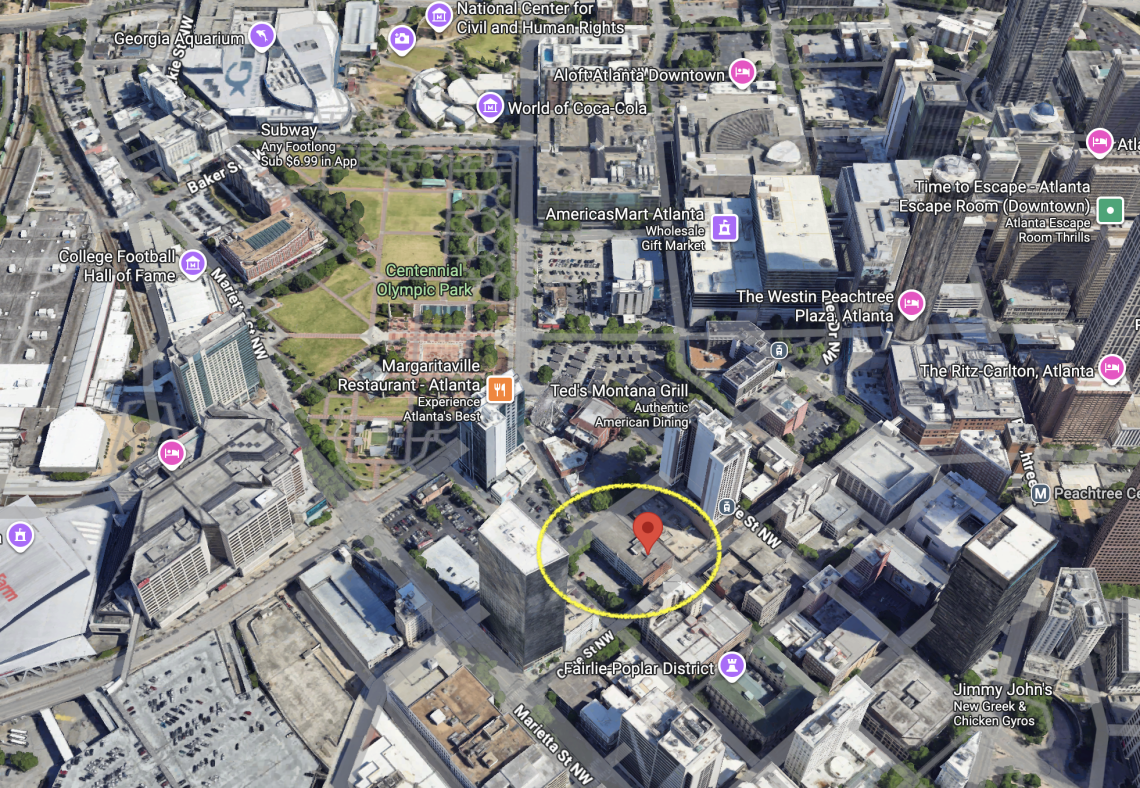 Overview of the 98 Cone St./0 Walton St. site and its proximity to Centennial Olympic Park. Google Maps