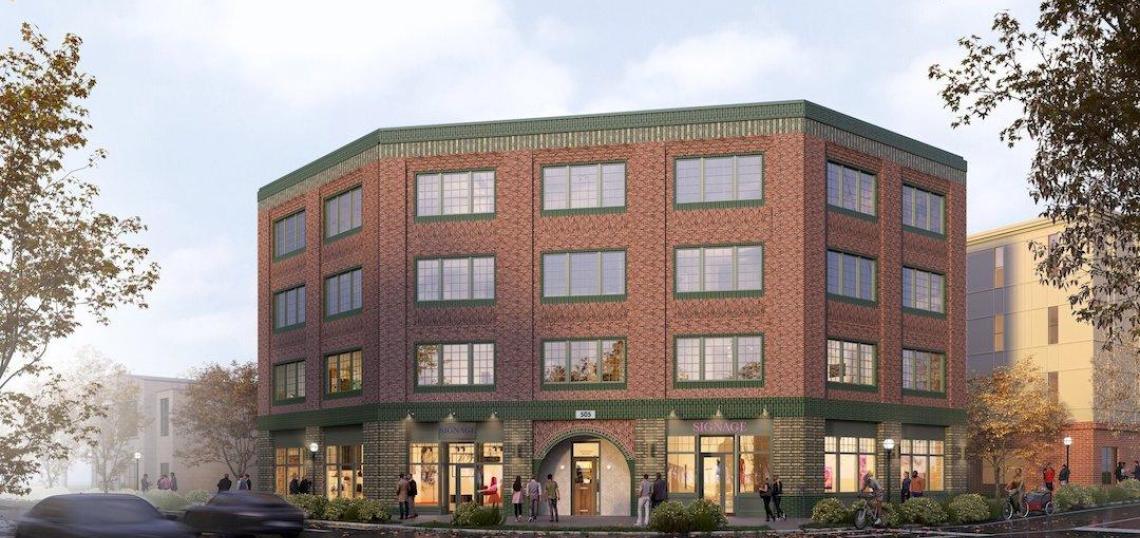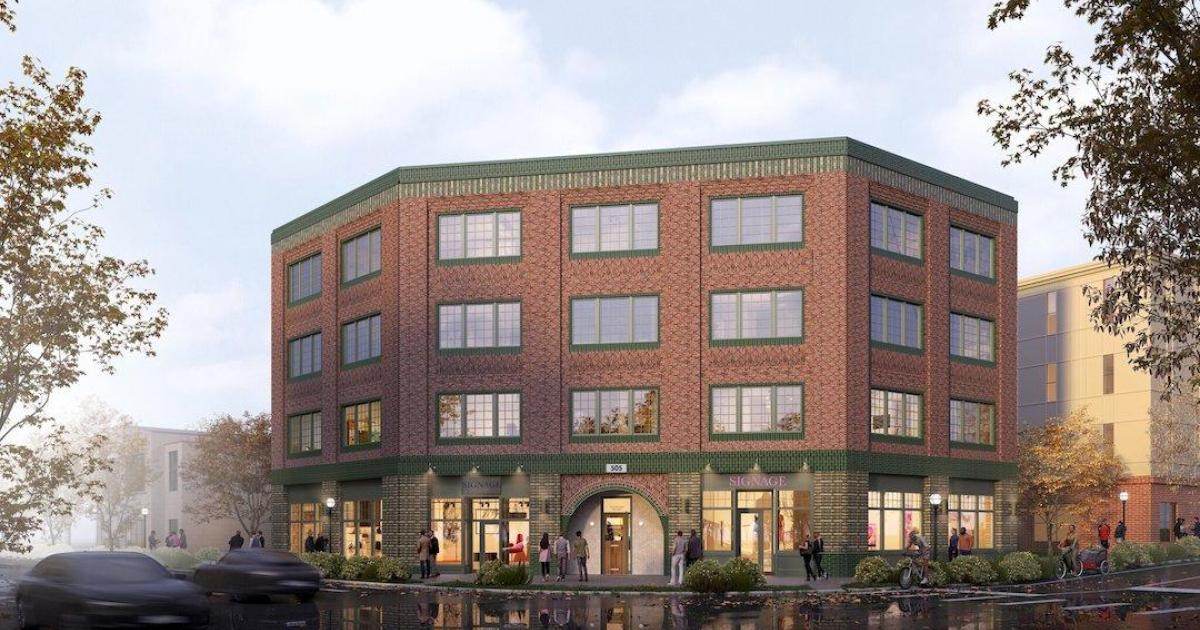 Plans for the steel-framed corner building call for ground-floor retail space with three levels of offices above. An arched main entry and retail signage would be prominent at the building’s corner, per revised renderings.