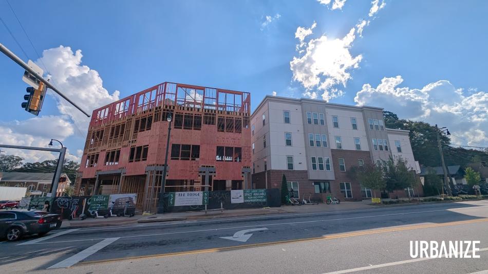 How the future brick-clad retail and office component stacks up today (left) next to existing The Lodge residential buildings. Josh Green/Urbanize Atlanta