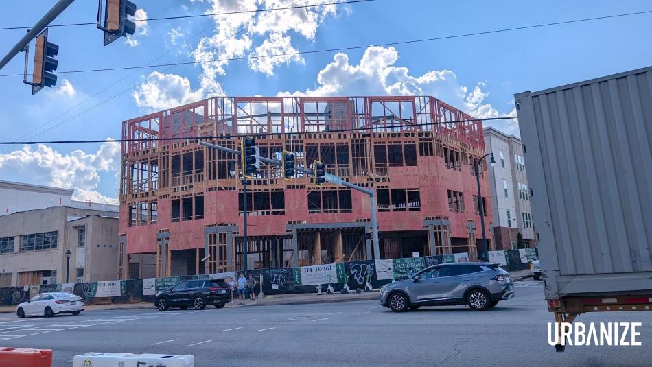 A project rep tells Urbanize Atlanta the corner building should reach its max height by the end of October. Also by month’s end, at least one anchor tenant should be ready to be announced, we’re told, but no other details were provided.