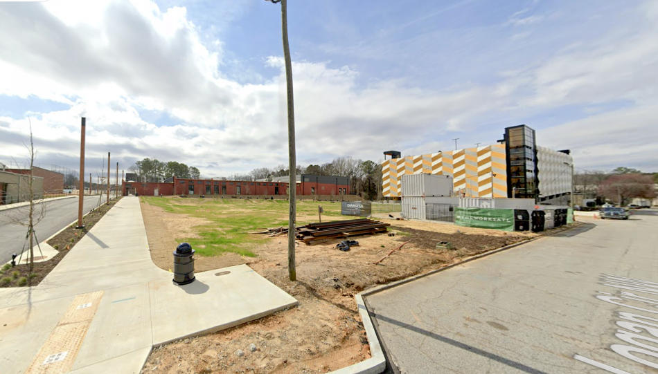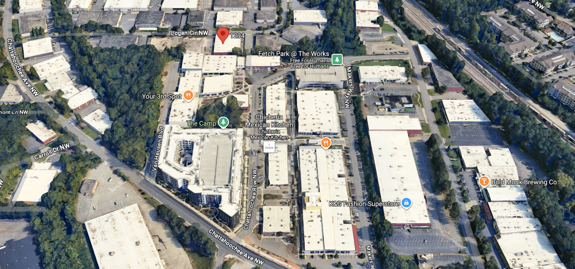 The 1294 Logan Circle site in question (at top), prior to the demolition of a low-rise office building, with The Works' main entrance along Chattahoochee Avenue at bottom. Google Maps