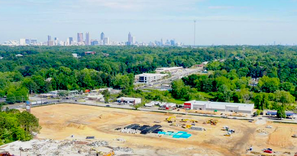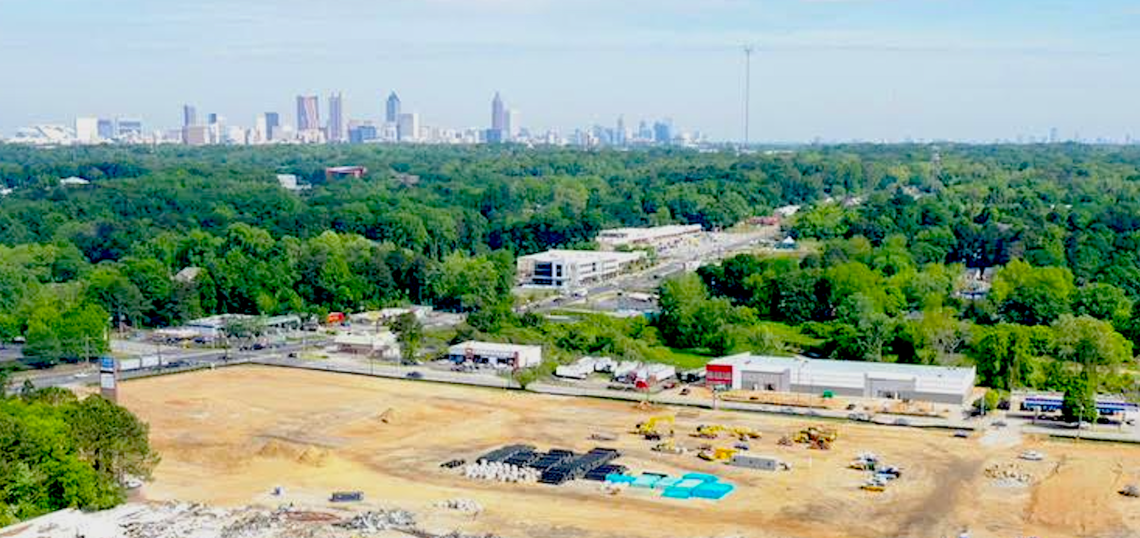 Recent aerial over the Array site, with the Allora Eastland project shown at bottom and downtown, Midtown, and Buckhead skylines at top. LaRuche Photo, via McKinley Homes/GAMLS