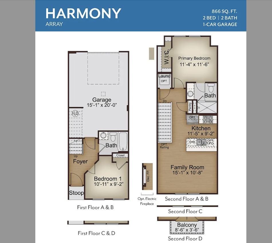 That buys two bedrooms and two bathrooms in 866 square feet, spread across two stories, plus a one-car garage.
