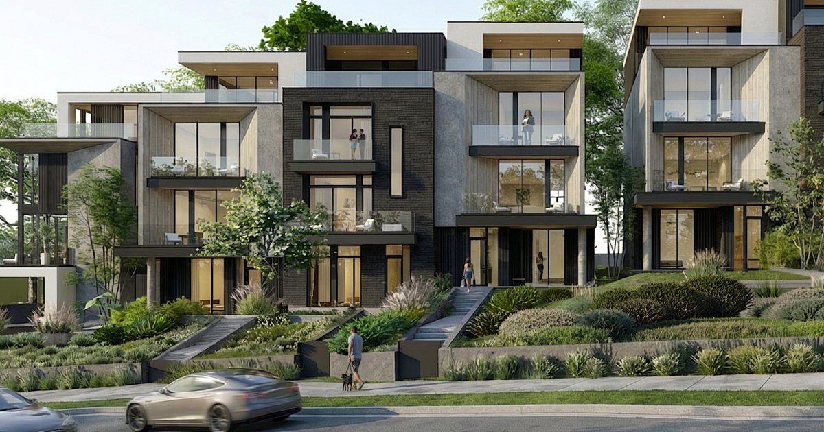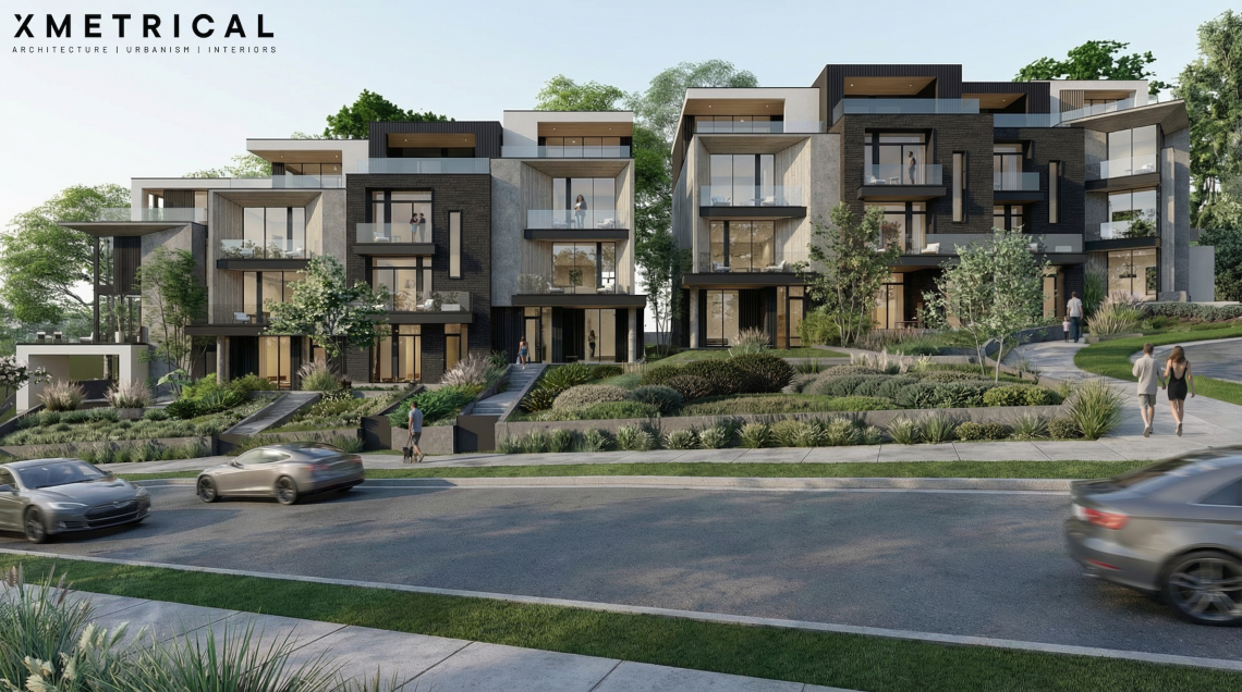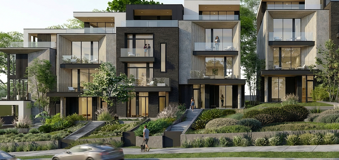 Planned modern facades and balconies at a sloped section of the Veridian Buckhead Townhomes site. Veridian Buckhead/Intown Atlanta Fine Homes Sotheby’s International Realty; designs, Xmetrical