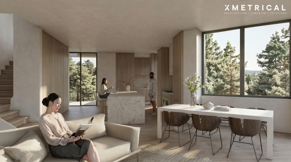 “To me, it’s a refined contemporary modern expression with a subtle Frank Lloyd Wright influence—particularly in how the buildings are integrated into the terrain,” Snow wrote to Urbanize Atlanta via email. “The exterior expression is clean and intentional—layered materials, strong horizontal lines, expansive glass, and deep overhangs—but what really makes it special is how it feels grounded in its environment.”
