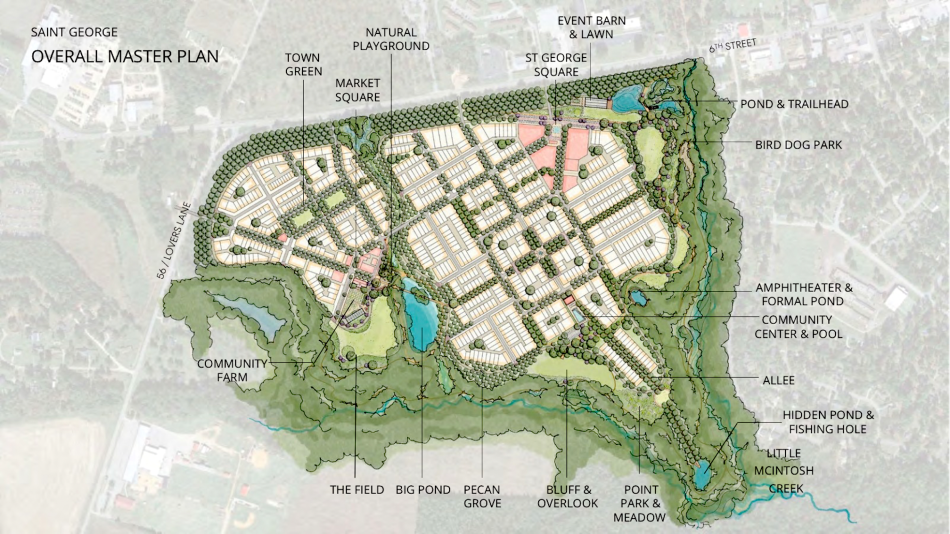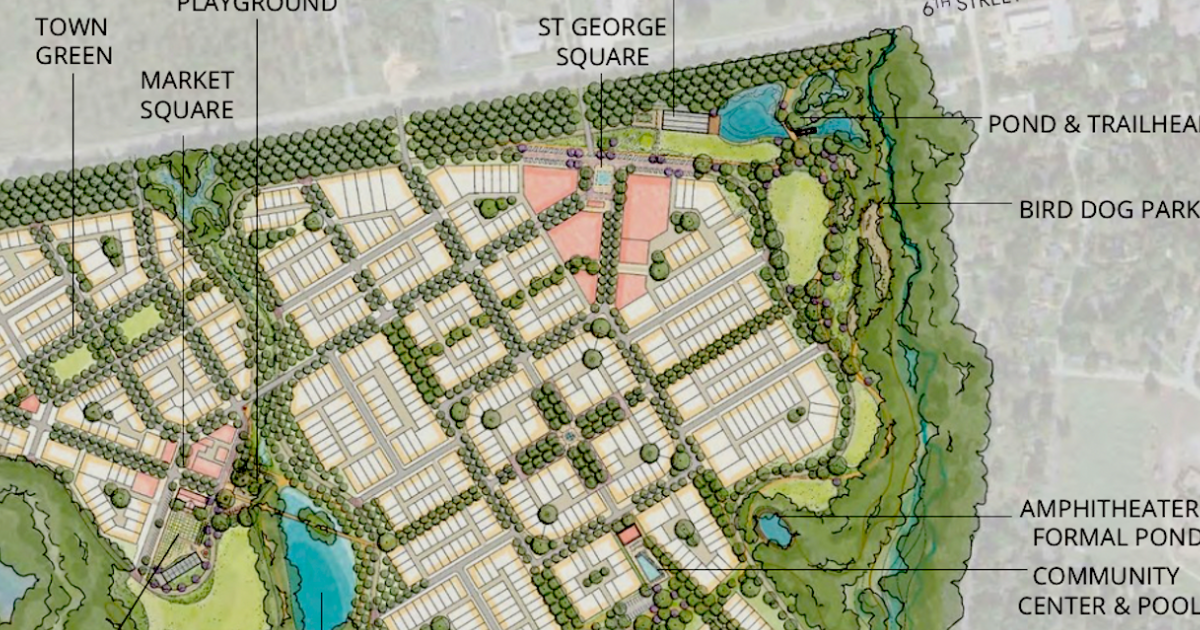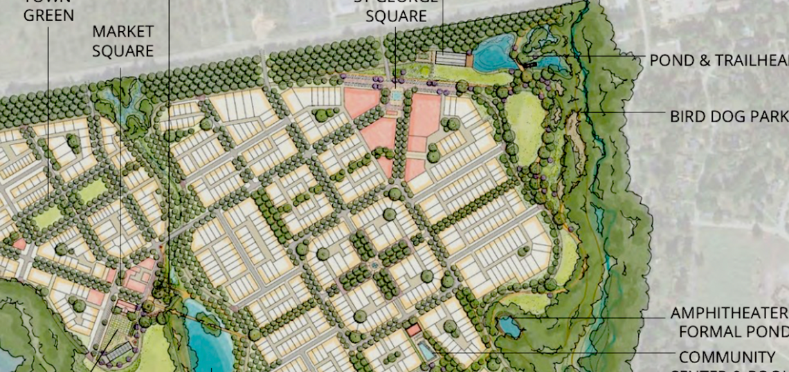 Should plans come to fruition, St. George Crossing will see an array of 1,600 residential units sprout up, ranging from multifamily buildings up to six stories tall, cottages, and townhomes to larger, custom single-family homes. No home will be more than a two-minute walk from an open greenspace, according to the approved masterplan. Included will be relatively affordable “missing middle” housing types and walkable commercial and retail spaces, per developers.