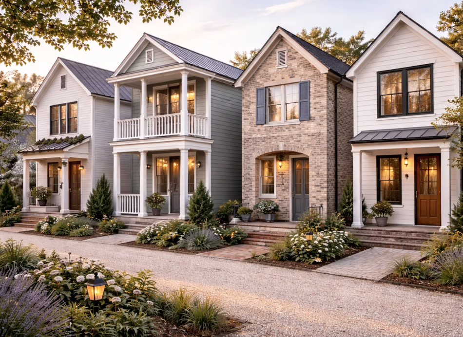 Planned look of single-family homes, designed to promote walkability, "neighborly interaction, front-porch culture, and a shared sense of place," per project leaders. Courtesy of Abebe Ventures/St. George Crossing