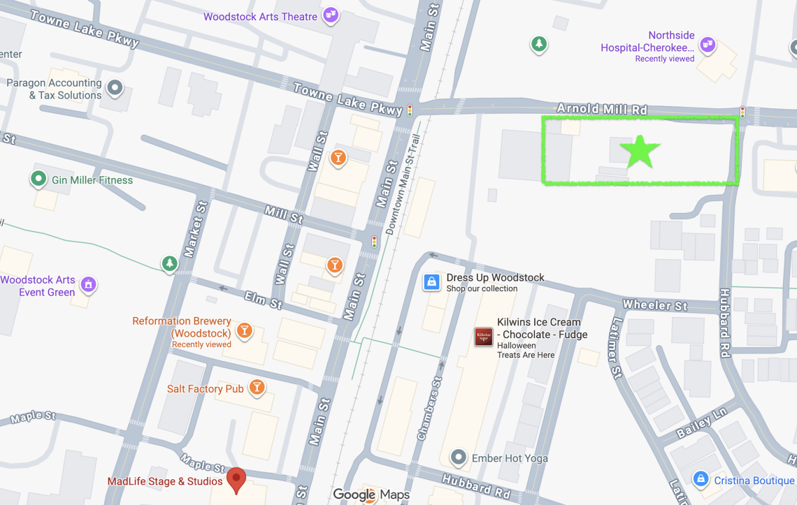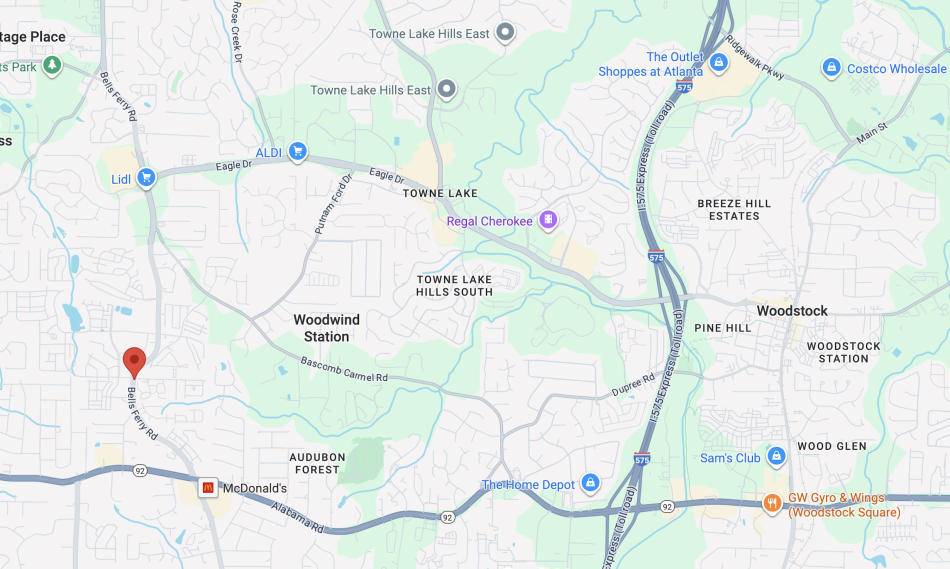 Location of Sutton Row’s 9-acre site in relation to Interstate 575 and downtown Woodstock (at right). Google Maps