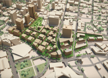 Western view of Centennial Yards depicts mini-city enmeshed in downtown