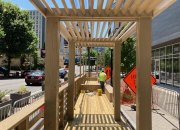 On-street parking is being converted to spaces for people in four locations around the growing subdistrict